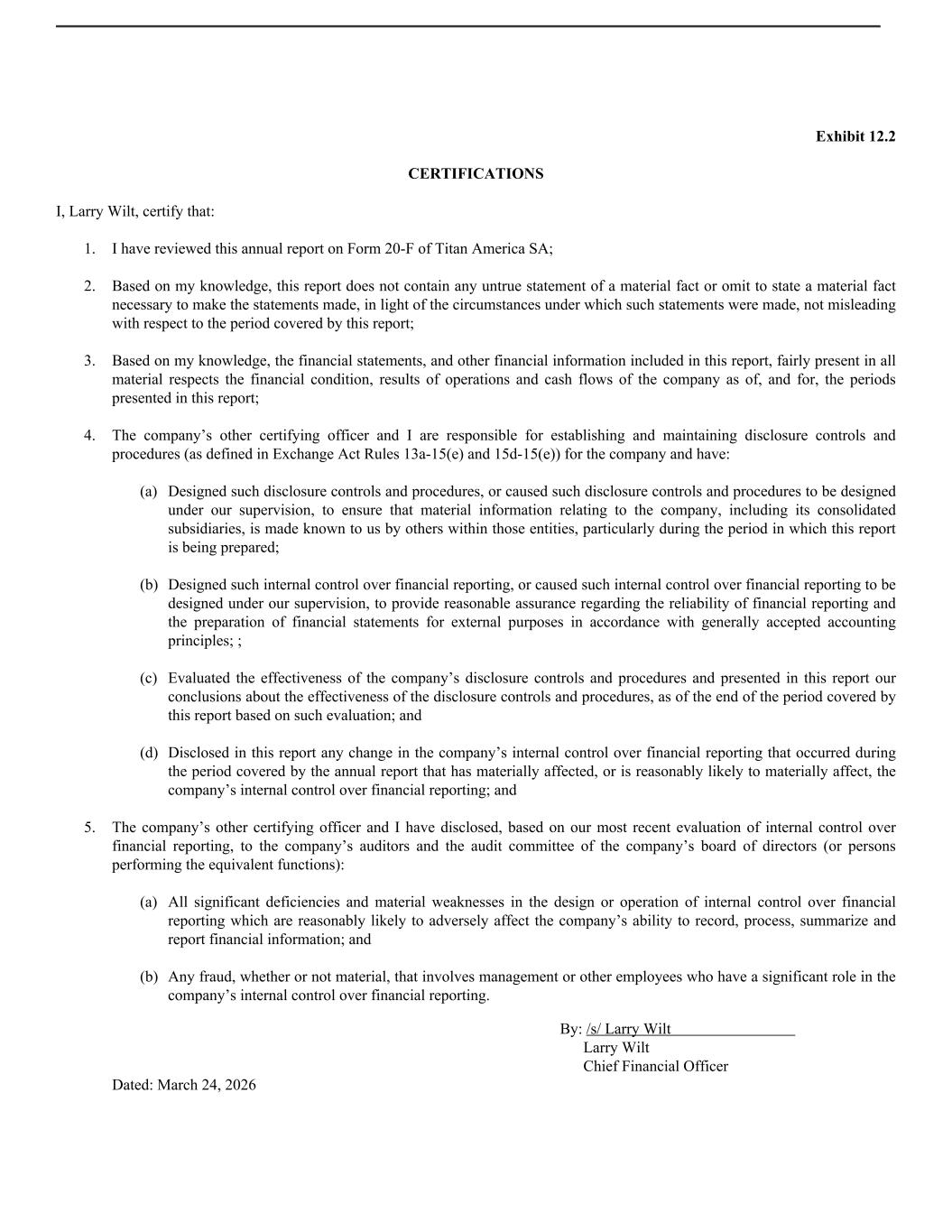 Exhibit 12.2 CERTIFICATIONS I, Larry Wilt, certify that: 1. I have reviewed this annual report on Form 20-F of Titan America SA; 2. Based on my knowledge, this report does not contain any untrue statement of a material fact or omit to state a material fact necessary to make the statements made, in light of the circumstances under which such statements were made, not misleading with respect to the period covered by this report; 3. Based on my knowledge, the financial statements, and other financial information included in this report, fairly present in all material respects the financial condition, results of operations and cash flows of the company as of, and for, the periods presented in this report; 4. The company’s other certifying officer and I are responsible for establishing and maintaining disclosure controls and procedures (as defined in Exchange Act Rules 13a-15(e) and 15d-15(e)) for the company and have: (a) Designed such disclosure controls and procedures, or caused such disclosure controls and procedures to be designed under our supervision, to ensure that material information relating to the company, including its consolidated subsidiaries, is made known to us by others within those entities, particularly during the period in which this report is being prepared; (b) Designed such internal control over financial reporting, or caused such internal control over financial reporting to be designed under our supervision, to provide reasonable assurance regarding the reliability of financial reporting and the preparation of financial statements for external purposes in accordance with generally accepted accounting principles; ; (c) Evaluated the effectiveness of the company’s disclosure controls and procedures and presented in this report our conclusions about the effectiveness of the disclosure controls and procedures, as of the end of the period covered by this report based on such evaluation; and (d) Disclosed in this report any change in the company’s internal control over financial reporting that occurred during the period covered by the annual report that has materially affected, or is reasonably likely to materially affect, the company’s internal control over financial reporting; and 5. The company’s other certifying officer and I have disclosed, based on our most recent evaluation of internal control over financial reporting, to the company’s auditors and the audit committee of the company’s board of directors (or persons performing the equivalent functions): (a) All significant deficiencies and material weaknesses in the design or operation of internal control over financial reporting which are reasonably likely to adversely affect the company’s ability to record, process, summarize and report financial information; and (b) Any fraud, whether or not material, that involves management or other employees who have a significant role in the company’s internal control over financial reporting. By: /s/ Larry Wilt Larry Wilt Chief Financial Officer Dated: March 24, 2026 __________________________________________________________________________________________________________