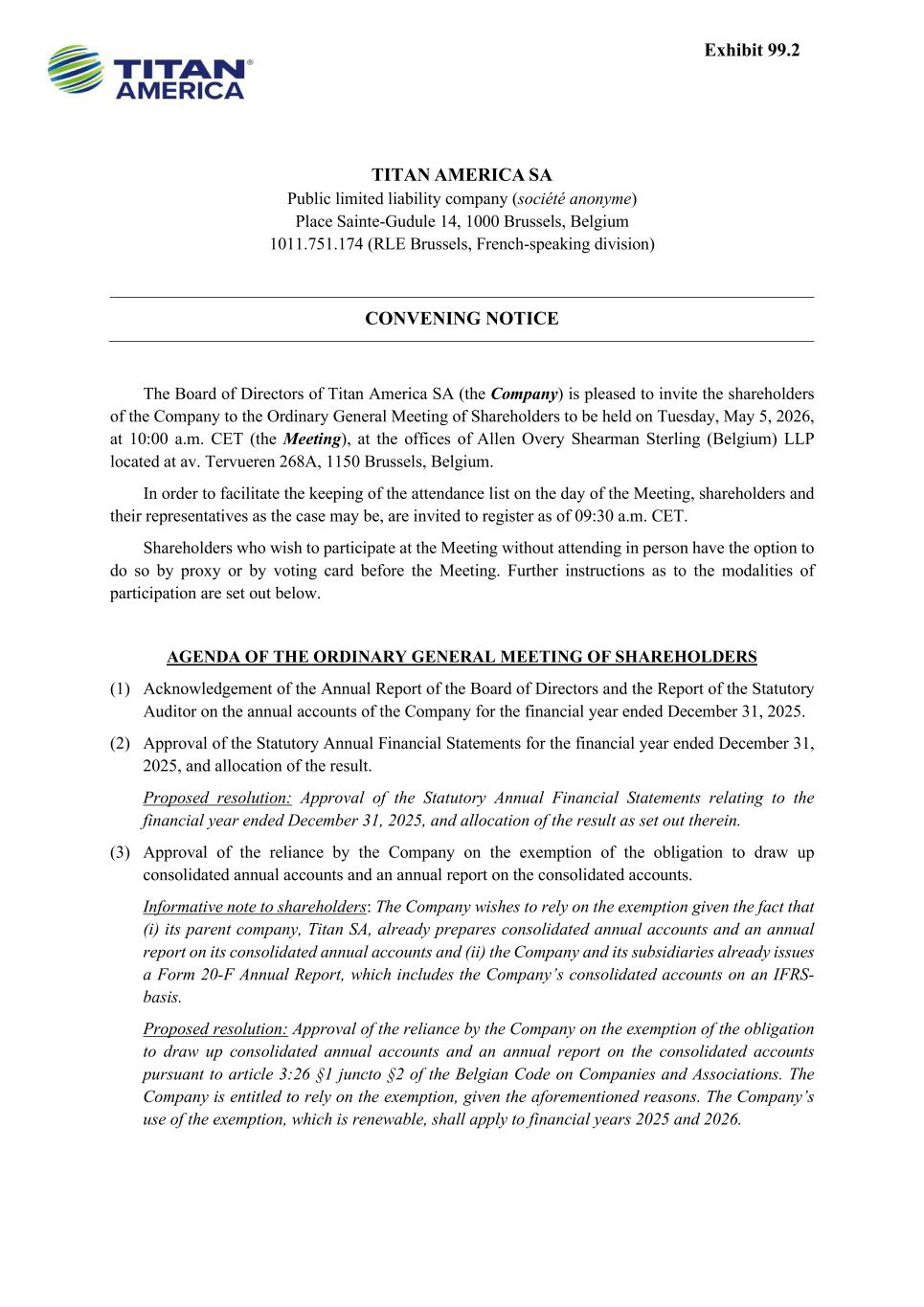 TITAN AMERICA SA Public limited liability company (société anonyme) Place Sainte-Gudule 14, 1000 Brussels, Belgium 1011.751.174 (RLE Brussels, French-speaking division) CONVENING NOTICE The Board of Directors of Titan America SA (the Company) is pleased to invite the shareholders of the Company to the Ordinary General Meeting of Shareholders to be held on Tuesday, May 5, 2026, at 10:00 a.m. CET (the Meeting), at the offices of Allen Overy Shearman Sterling (Belgium) LLP located at av. Tervueren 268A, 1150 Brussels, Belgium. In order to facilitate the keeping of the attendance list on the day of the Meeting, shareholders and their representatives as the case may be, are invited to register as of 09:30 a.m. CET. Shareholders who wish to participate at the Meeting without attending in person have the option to do so by proxy or by voting card before the Meeting. Further instructions as to the modalities of participation are set out below. AGENDA OF THE ORDINARY GENERAL MEETING OF SHAREHOLDERS (1) Acknowledgement of the Annual Report of the Board of Directors and the Report of the Statutory Auditor on the annual accounts of the Company for the financial year ended December 31, 2025. (2) Approval of the Statutory Annual Financial Statements for the financial year ended December 31, 2025, and allocation of the result. Proposed resolution: Approval of the Statutory Annual Financial Statements relating to the financial year ended December 31, 2025, and allocation of the result as set out therein. (3) Approval of the reliance by the Company on the exemption of the obligation to draw up consolidated annual accounts and an annual report on the consolidated accounts. Informative note to shareholders: The Company wishes to rely on the exemption given the fact that (i) its parent company, Titan SA, already prepares consolidated annual accounts and an annual report on its consolidated annual accounts and (ii) the Company and its subsidiaries already issues a Form 20-F Annual Report, which includes the Company’s consolidated accounts on an IFRS- basis. Proposed resolution: Approval of the reliance by the Company on the exemption of the obligation to draw up consolidated annual accounts and an annual report on the consolidated accounts pursuant to article 3:26 §1 juncto §2 of the Belgian Code on Companies and Associations. The Company is entitled to rely on the exemption, given the aforementioned reasons. The Company’s use of the exemption, which is renewable, shall apply to financial years 2025 and 2026. Exhibit 99.2