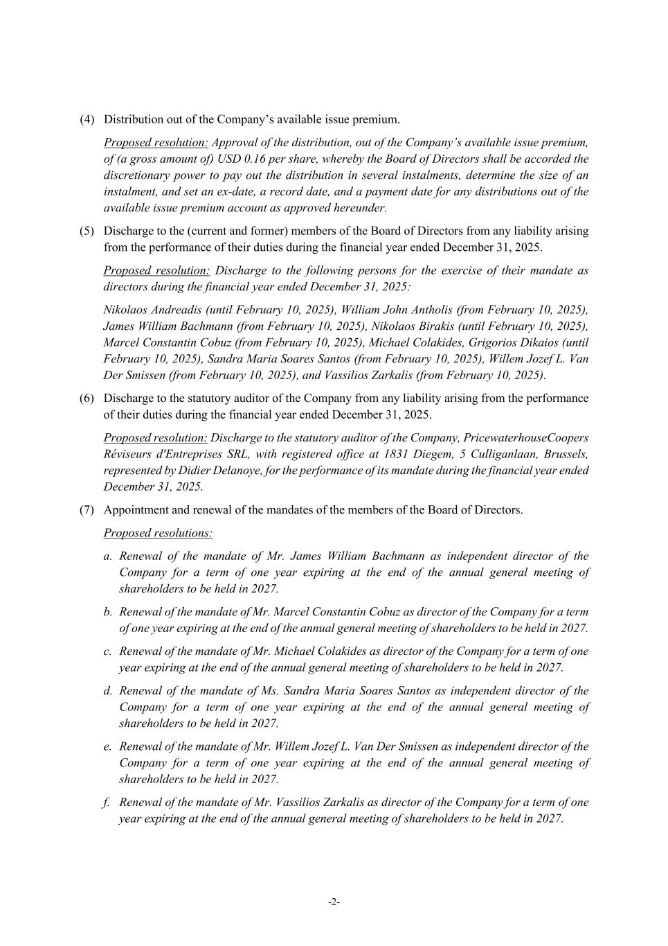 -2- (4) Distribution out of the Company’s available issue premium. Proposed resolution: Approval of the distribution, out of the Company’s available issue premium, of (a gross amount of) USD 0.16 per share, whereby the Board of Directors shall be accorded the discretionary power to pay out the distribution in several instalments, determine the size of an instalment, and set an ex-date, a record date, and a payment date for any distributions out of the available issue premium account as approved hereunder. (5) Discharge to the (current and former) members of the Board of Directors from any liability arising from the performance of their duties during the financial year ended December 31, 2025. Proposed resolution: Discharge to the following persons for the exercise of their mandate as directors during the financial year ended December 31, 2025: Nikolaos Andreadis (until February 10, 2025), William John Antholis (from February 10, 2025), James William Bachmann (from February 10, 2025), Nikolaos Birakis (until February 10, 2025), Marcel Constantin Cobuz (from February 10, 2025), Michael Colakides, Grigorios Dikaios (until February 10, 2025), Sandra Maria Soares Santos (from February 10, 2025), Willem Jozef L. Van Der Smissen (from February 10, 2025), and Vassilios Zarkalis (from February 10, 2025). (6) Discharge to the statutory auditor of the Company from any liability arising from the performance of their duties during the financial year ended December 31, 2025. Proposed resolution: Discharge to the statutory auditor of the Company, PricewaterhouseCoopers Réviseurs d'Entreprises SRL, with registered office at 1831 Diegem, 5 Culliganlaan, Brussels, represented by Didier Delanoye, for the performance of its mandate during the financial year ended December 31, 2025. (7) Appointment and renewal of the mandates of the members of the Board of Directors. Proposed resolutions: a. Renewal of the mandate of Mr. James William Bachmann as independent director of the Company for a term of one year expiring at the end of the annual general meeting of shareholders to be held in 2027. b. Renewal of the mandate of Mr. Marcel Constantin Cobuz as director of the Company for a term of one year expiring at the end of the annual general meeting of shareholders to be held in 2027. c. Renewal of the mandate of Mr. Michael Colakides as director of the Company for a term of one year expiring at the end of the annual general meeting of shareholders to be held in 2027. d. Renewal of the mandate of Ms. Sandra Maria Soares Santos as independent director of the Company for a term of one year expiring at the end of the annual general meeting of shareholders to be held in 2027. e. Renewal of the mandate of Mr. Willem Jozef L. Van Der Smissen as independent director of the Company for a term of one year expiring at the end of the annual general meeting of shareholders to be held in 2027. f. Renewal of the mandate of Mr. Vassilios Zarkalis as director of the Company for a term of one year expiring at the end of the annual general meeting of shareholders to be held in 2027.