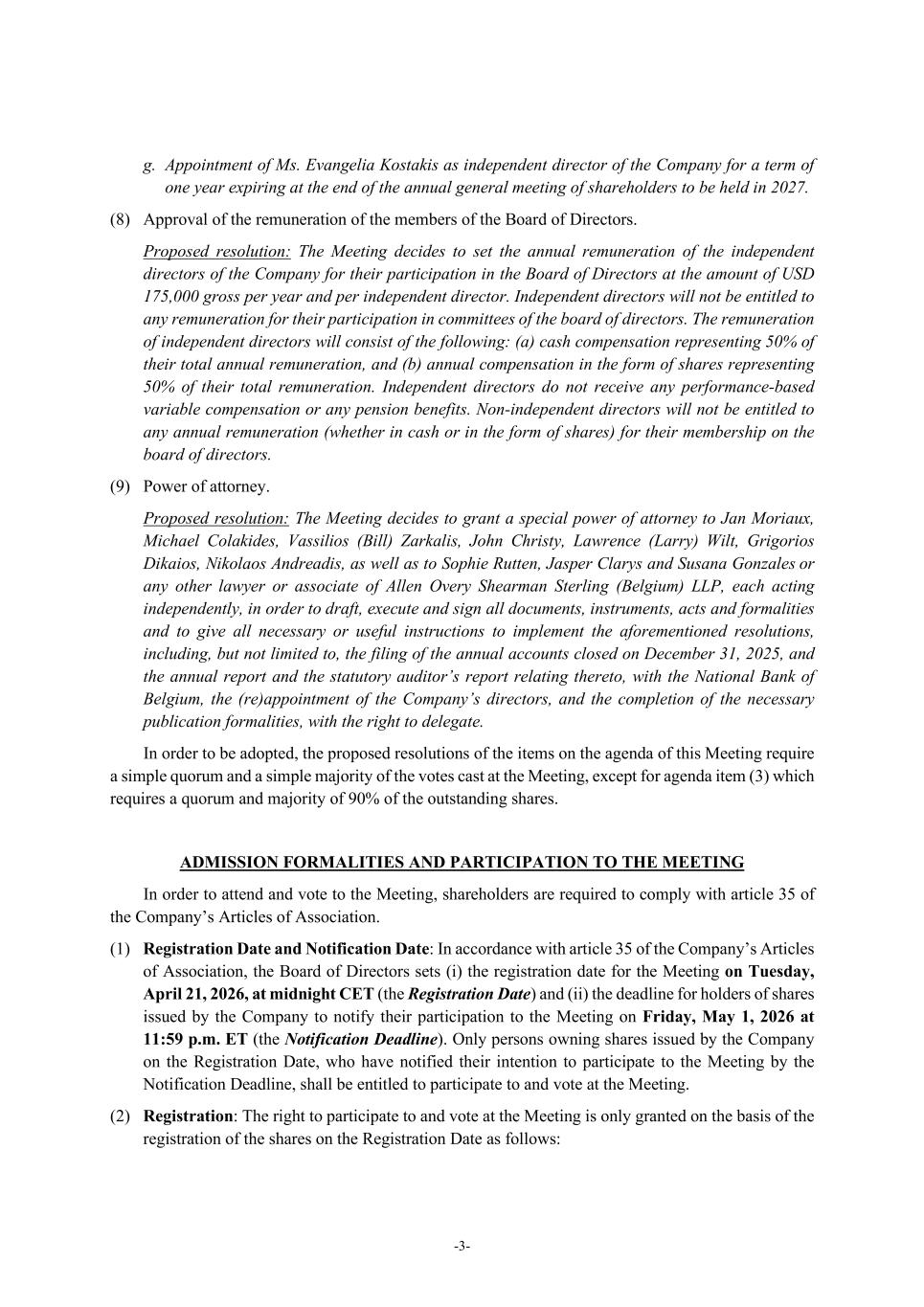-3- g. Appointment of Ms. Evangelia Kostakis as independent director of the Company for a term of one year expiring at the end of the annual general meeting of shareholders to be held in 2027. (8) Approval of the remuneration of the members of the Board of Directors. Proposed resolution: The Meeting decides to set the annual remuneration of the independent directors of the Company for their participation in the Board of Directors at the amount of USD 175,000 gross per year and per independent director. Independent directors will not be entitled to any remuneration for their participation in committees of the board of directors. The remuneration of independent directors will consist of the following: (a) cash compensation representing 50% of their total annual remuneration, and (b) annual compensation in the form of shares representing 50% of their total remuneration. Independent directors do not receive any performance-based variable compensation or any pension benefits. Non-independent directors will not be entitled to any annual remuneration (whether in cash or in the form of shares) for their membership on the board of directors. (9) Power of attorney. Proposed resolution: The Meeting decides to grant a special power of attorney to Jan Moriaux, Michael Colakides, Vassilios (Bill) Zarkalis, John Christy, Lawrence (Larry) Wilt, Grigorios Dikaios, Nikolaos Andreadis, as well as to Sophie Rutten, Jasper Clarys and Susana Gonzales or any other lawyer or associate of Allen Overy Shearman Sterling (Belgium) LLP, each acting independently, in order to draft, execute and sign all documents, instruments, acts and formalities and to give all necessary or useful instructions to implement the aforementioned resolutions, including, but not limited to, the filing of the annual accounts closed on December 31, 2025, and the annual report and the statutory auditor’s report relating thereto, with the National Bank of Belgium, the (re)appointment of the Company’s directors, and the completion of the necessary publication formalities, with the right to delegate. In order to be adopted, the proposed resolutions of the items on the agenda of this Meeting require a simple quorum and a simple majority of the votes cast at the Meeting, except for agenda item (3) which requires a quorum and majority of 90% of the outstanding shares. ADMISSION FORMALITIES AND PARTICIPATION TO THE MEETING In order to attend and vote to the Meeting, shareholders are required to comply with article 35 of the Company’s Articles of Association. (1) Registration Date and Notification Date: In accordance with article 35 of the Company’s Articles of Association, the Board of Directors sets (i) the registration date for the Meeting on Tuesday, April 21, 2026, at midnight CET (the Registration Date) and (ii) the deadline for holders of shares issued by the Company to notify their participation to the Meeting on Friday, May 1, 2026 at 11:59 p.m. ET (the Notification Deadline). Only persons owning shares issued by the Company on the Registration Date, who have notified their intention to participate to the Meeting by the Notification Deadline, shall be entitled to participate to and vote at the Meeting. (2) Registration: The right to participate to and vote at the Meeting is only granted on the basis of the registration of the shares on the Registration Date as follows: