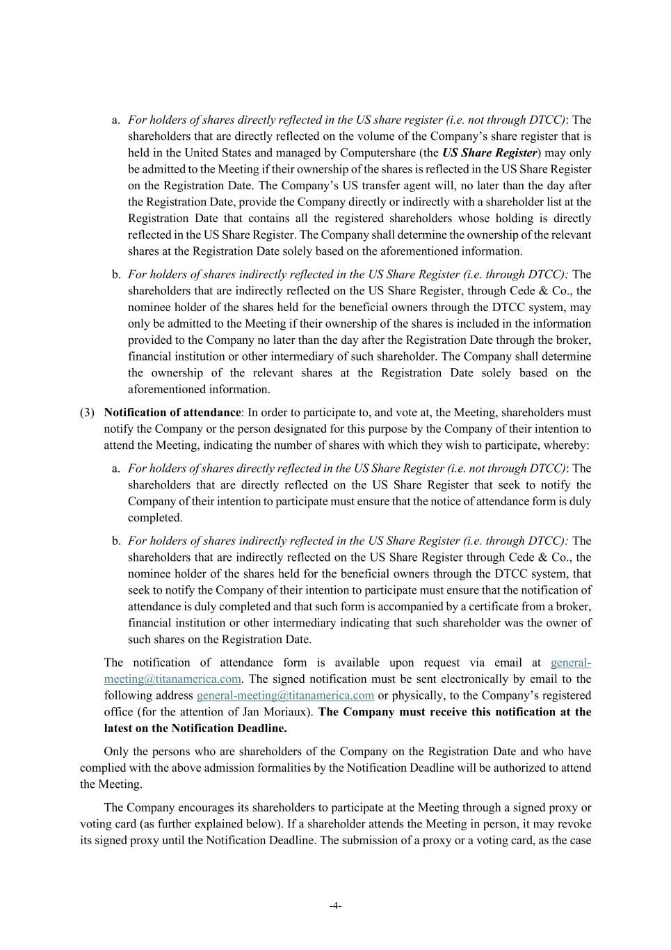 -4- a. For holders of shares directly reflected in the US share register (i.e. not through DTCC): The shareholders that are directly reflected on the volume of the Company’s share register that is held in the United States and managed by Computershare (the US Share Register) may only be admitted to the Meeting if their ownership of the shares is reflected in the US Share Register on the Registration Date. The Company’s US transfer agent will, no later than the day after the Registration Date, provide the Company directly or indirectly with a shareholder list at the Registration Date that contains all the registered shareholders whose holding is directly reflected in the US Share Register. The Company shall determine the ownership of the relevant shares at the Registration Date solely based on the aforementioned information. b. For holders of shares indirectly reflected in the US Share Register (i.e. through DTCC): The shareholders that are indirectly reflected on the US Share Register, through Cede & Co., the nominee holder of the shares held for the beneficial owners through the DTCC system, may only be admitted to the Meeting if their ownership of the shares is included in the information provided to the Company no later than the day after the Registration Date through the broker, financial institution or other intermediary of such shareholder. The Company shall determine the ownership of the relevant shares at the Registration Date solely based on the aforementioned information. (3) Notification of attendance: In order to participate to, and vote at, the Meeting, shareholders must notify the Company or the person designated for this purpose by the Company of their intention to attend the Meeting, indicating the number of shares with which they wish to participate, whereby: a. For holders of shares directly reflected in the US Share Register (i.e. not through DTCC): The shareholders that are directly reflected on the US Share Register that seek to notify the Company of their intention to participate must ensure that the notice of attendance form is duly completed. b. For holders of shares indirectly reflected in the US Share Register (i.e. through DTCC): The shareholders that are indirectly reflected on the US Share Register through Cede & Co., the nominee holder of the shares held for the beneficial owners through the DTCC system, that seek to notify the Company of their intention to participate must ensure that the notification of attendance is duly completed and that such form is accompanied by a certificate from a broker, financial institution or other intermediary indicating that such shareholder was the owner of such shares on the Registration Date. The notification of attendance form is available upon request via email at general- meeting@titanamerica.com. The signed notification must be sent electronically by email to the following address general-meeting@titanamerica.com or physically, to the Company’s registered office (for the attention of Jan Moriaux). The Company must receive this notification at the latest on the Notification Deadline. Only the persons who are shareholders of the Company on the Registration Date and who have complied with the above admission formalities by the Notification Deadline will be authorized to attend the Meeting. The Company encourages its shareholders to participate at the Meeting through a signed proxy or voting card (as further explained below). If a shareholder attends the Meeting in person, it may revoke its signed proxy until the Notification Deadline. The submission of a proxy or a voting card, as the case