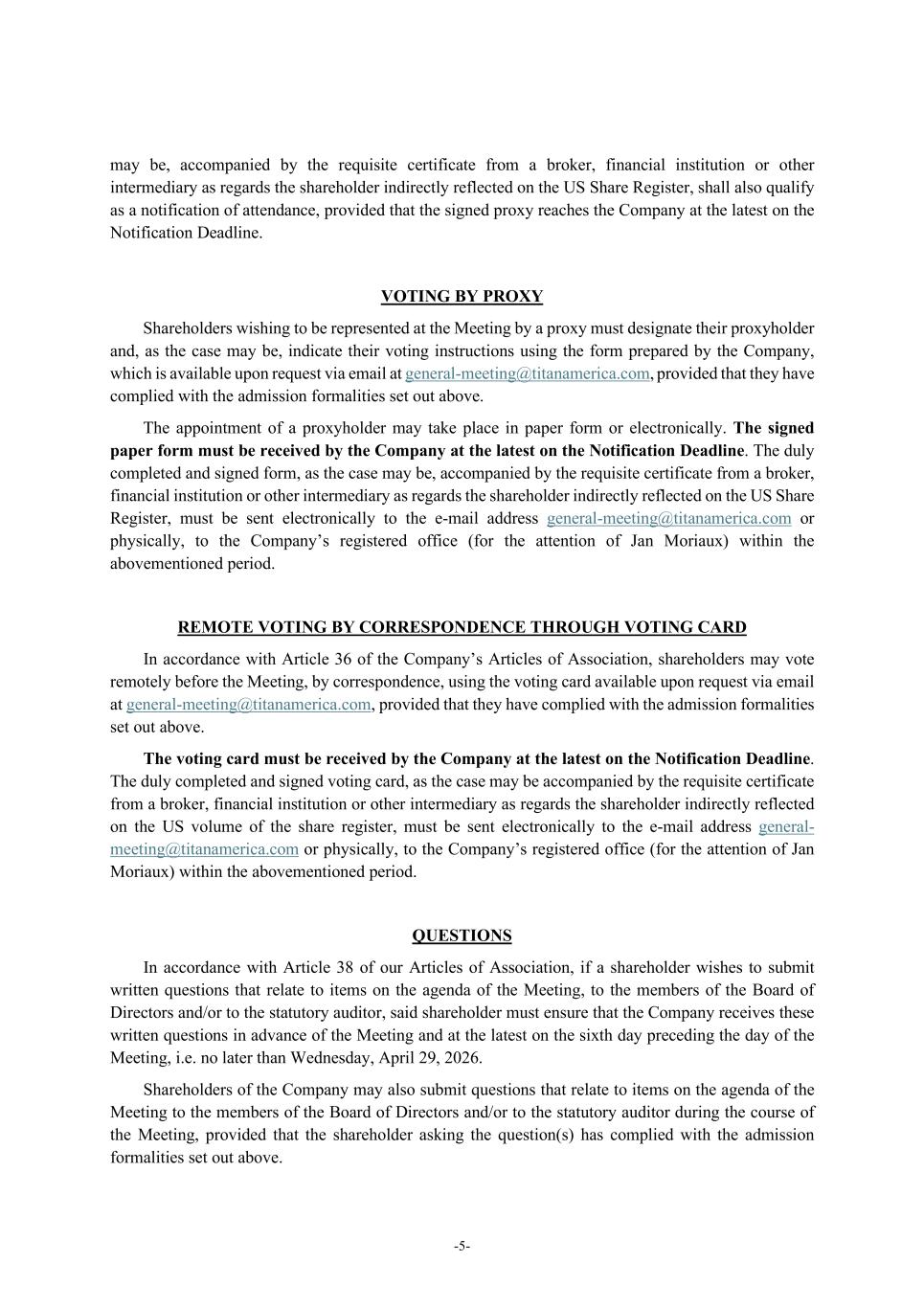-5- may be, accompanied by the requisite certificate from a broker, financial institution or other intermediary as regards the shareholder indirectly reflected on the US Share Register, shall also qualify as a notification of attendance, provided that the signed proxy reaches the Company at the latest on the Notification Deadline. VOTING BY PROXY Shareholders wishing to be represented at the Meeting by a proxy must designate their proxyholder and, as the case may be, indicate their voting instructions using the form prepared by the Company, which is available upon request via email at general-meeting@titanamerica.com, provided that they have complied with the admission formalities set out above. The appointment of a proxyholder may take place in paper form or electronically. The signed paper form must be received by the Company at the latest on the Notification Deadline. The duly completed and signed form, as the case may be, accompanied by the requisite certificate from a broker, financial institution or other intermediary as regards the shareholder indirectly reflected on the US Share Register, must be sent electronically to the e-mail address general-meeting@titanamerica.com or physically, to the Company’s registered office (for the attention of Jan Moriaux) within the abovementioned period. REMOTE VOTING BY CORRESPONDENCE THROUGH VOTING CARD In accordance with Article 36 of the Company’s Articles of Association, shareholders may vote remotely before the Meeting, by correspondence, using the voting card available upon request via email at general-meeting@titanamerica.com, provided that they have complied with the admission formalities set out above. The voting card must be received by the Company at the latest on the Notification Deadline. The duly completed and signed voting card, as the case may be accompanied by the requisite certificate from a broker, financial institution or other intermediary as regards the shareholder indirectly reflected on the US volume of the share register, must be sent electronically to the e-mail address general- meeting@titanamerica.com or physically, to the Company’s registered office (for the attention of Jan Moriaux) within the abovementioned period. QUESTIONS In accordance with Article 38 of our Articles of Association, if a shareholder wishes to submit written questions that relate to items on the agenda of the Meeting, to the members of the Board of Directors and/or to the statutory auditor, said shareholder must ensure that the Company receives these written questions in advance of the Meeting and at the latest on the sixth day preceding the day of the Meeting, i.e. no later than Wednesday, April 29, 2026. Shareholders of the Company may also submit questions that relate to items on the agenda of the Meeting to the members of the Board of Directors and/or to the statutory auditor during the course of the Meeting, provided that the shareholder asking the question(s) has complied with the admission formalities set out above.