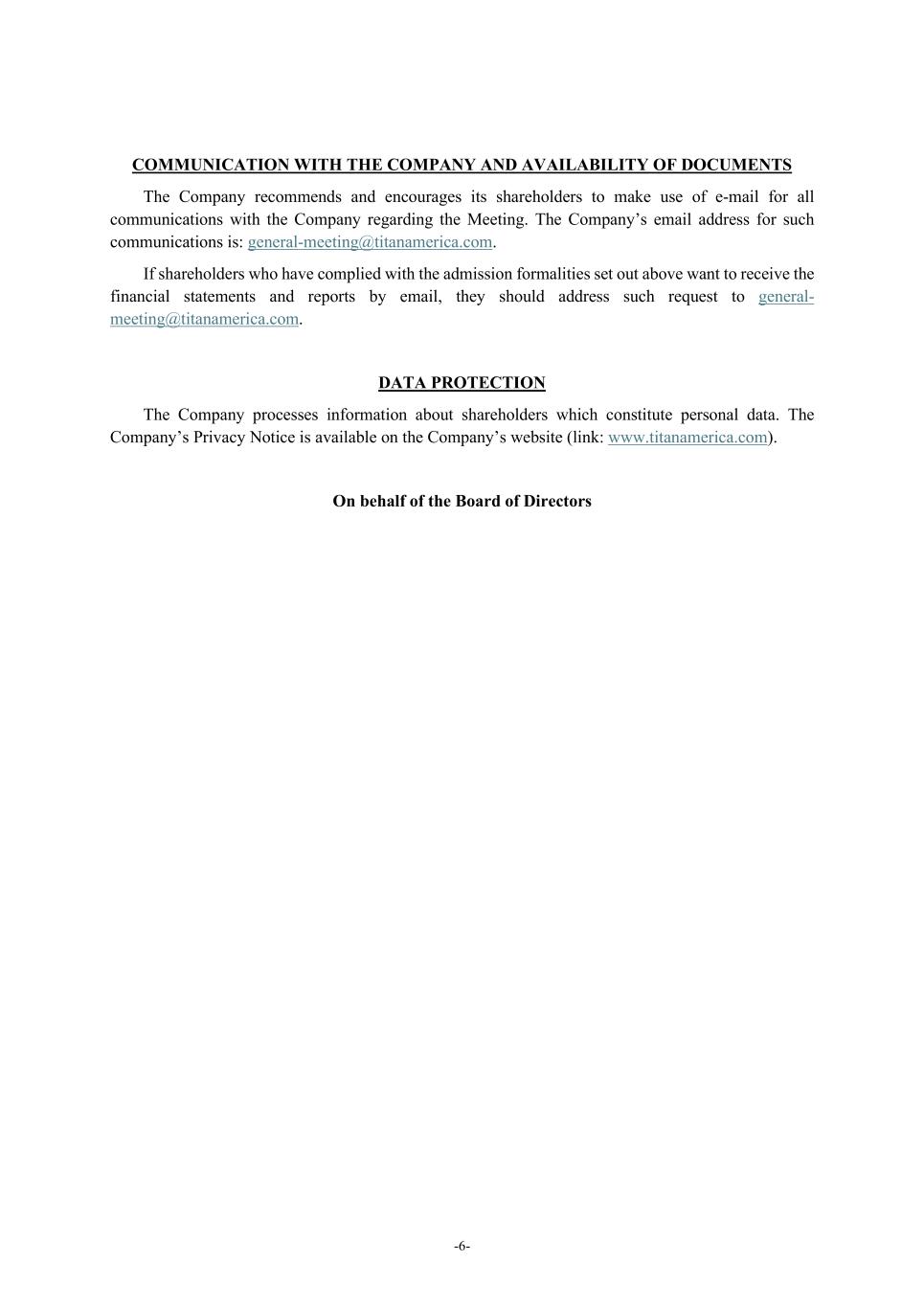 -6- COMMUNICATION WITH THE COMPANY AND AVAILABILITY OF DOCUMENTS The Company recommends and encourages its shareholders to make use of e-mail for all communications with the Company regarding the Meeting. The Company’s email address for such communications is: general-meeting@titanamerica.com. If shareholders who have complied with the admission formalities set out above want to receive the financial statements and reports by email, they should address such request to general- meeting@titanamerica.com. DATA PROTECTION The Company processes information about shareholders which constitute personal data. The Company’s Privacy Notice is available on the Company’s website (link: www.titanamerica.com). On behalf of the Board of Directors